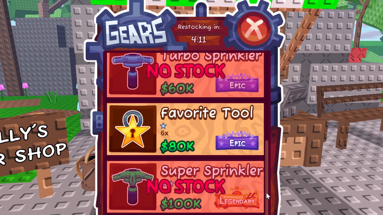 The shop's stock rotates every five minutes, and Legendary items have the lowest appearance rate. If you don't see the Super Sprinkler, close the menu, wait for the next rotation, and check again. Joining the Garden Horizons stock-tracking Discord server and enabling notifications can save you from camping the shop manually.