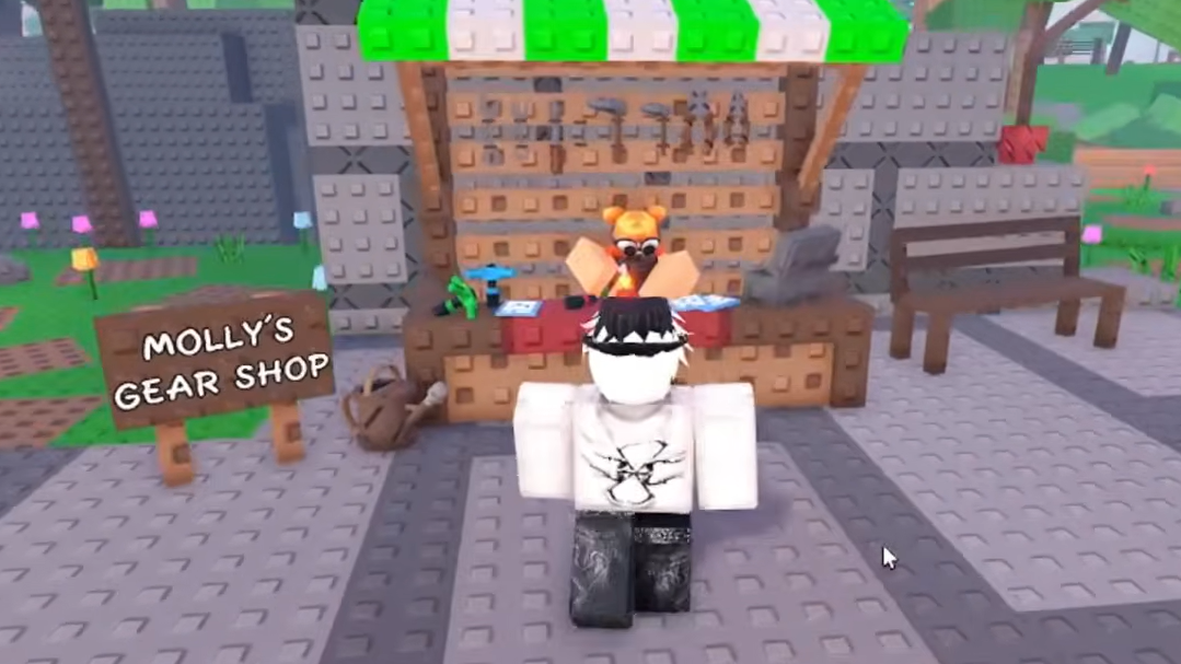 Step 1: Head to Molly's Gear Shop. The quickest route is to tap the Seeds button at the top of your screen to teleport near Bill's seed stall, then turn left. You'll spot Molly's stall under a white-and-green awning near the fountain area.