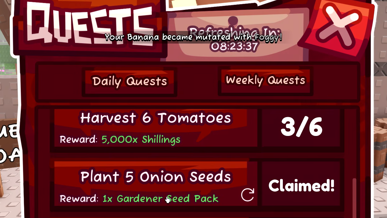 The quest board sits near the fountain in the central hub, right next to the shops. Daily quests reset every 24 hours and weekly quests every 7 days. Tasks are straightforward — plant a certain number of seeds, harvest specific crops, or earn a target amount of Shillings.