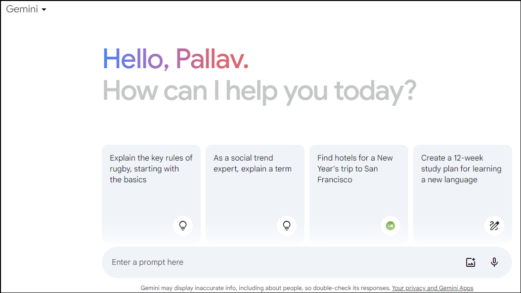 If you haven't already used Gemini Basic, it is quite similar to other AI models out there. It runs on the Gemini 1.0 Pro model, and you can enter prompts in the search bar and ask the AI to look up information, generate content, or create images.