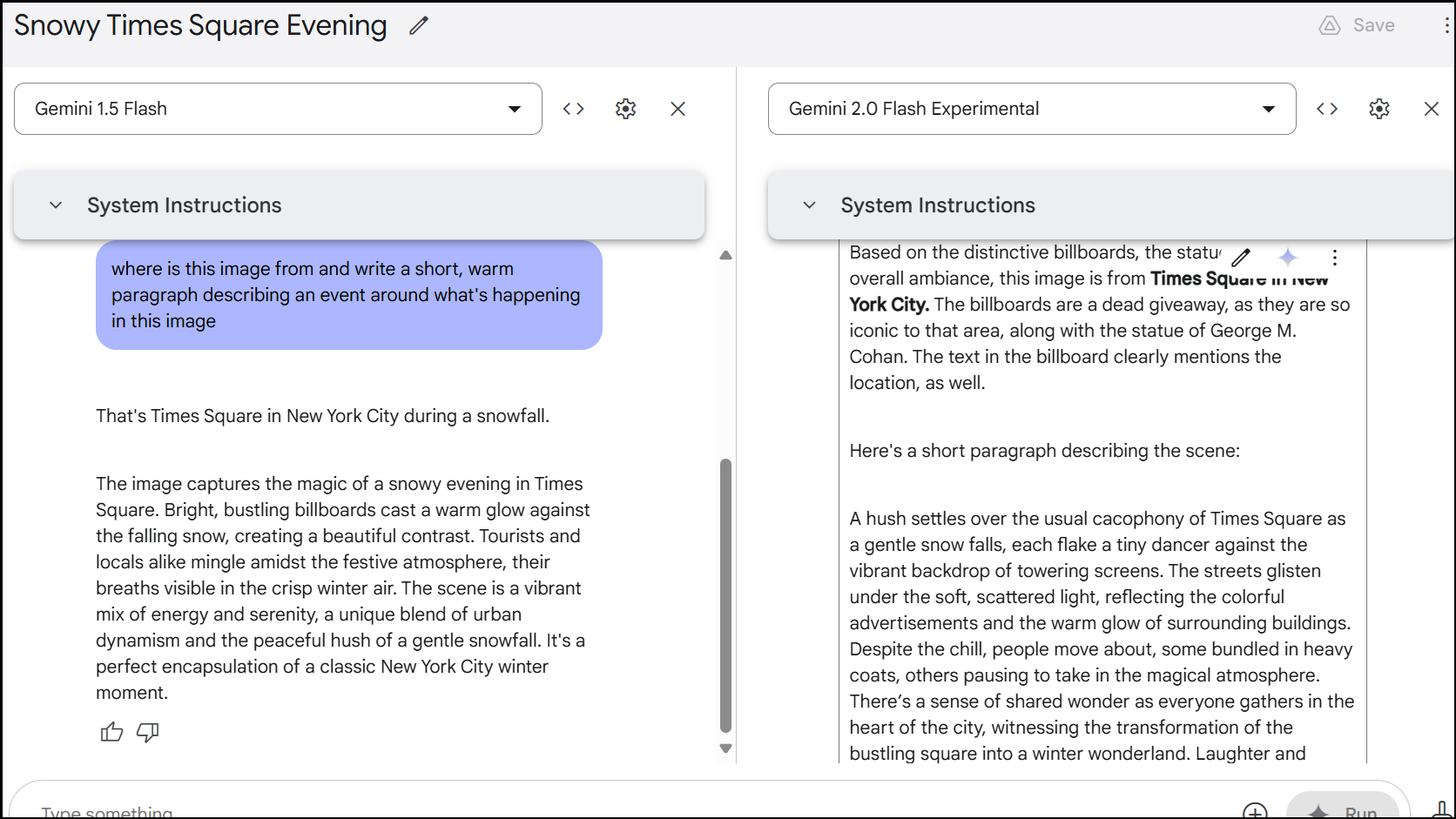 Both the models correctly identified the image. But Gemini 2.0 gave explanations for how it identified the image. Gemini 2.0 also effortlessly obliged to the second part of my request whereas Gemini 1.5 had trouble with it. While it did describe the image, it ignored rest of the request about making it warm.