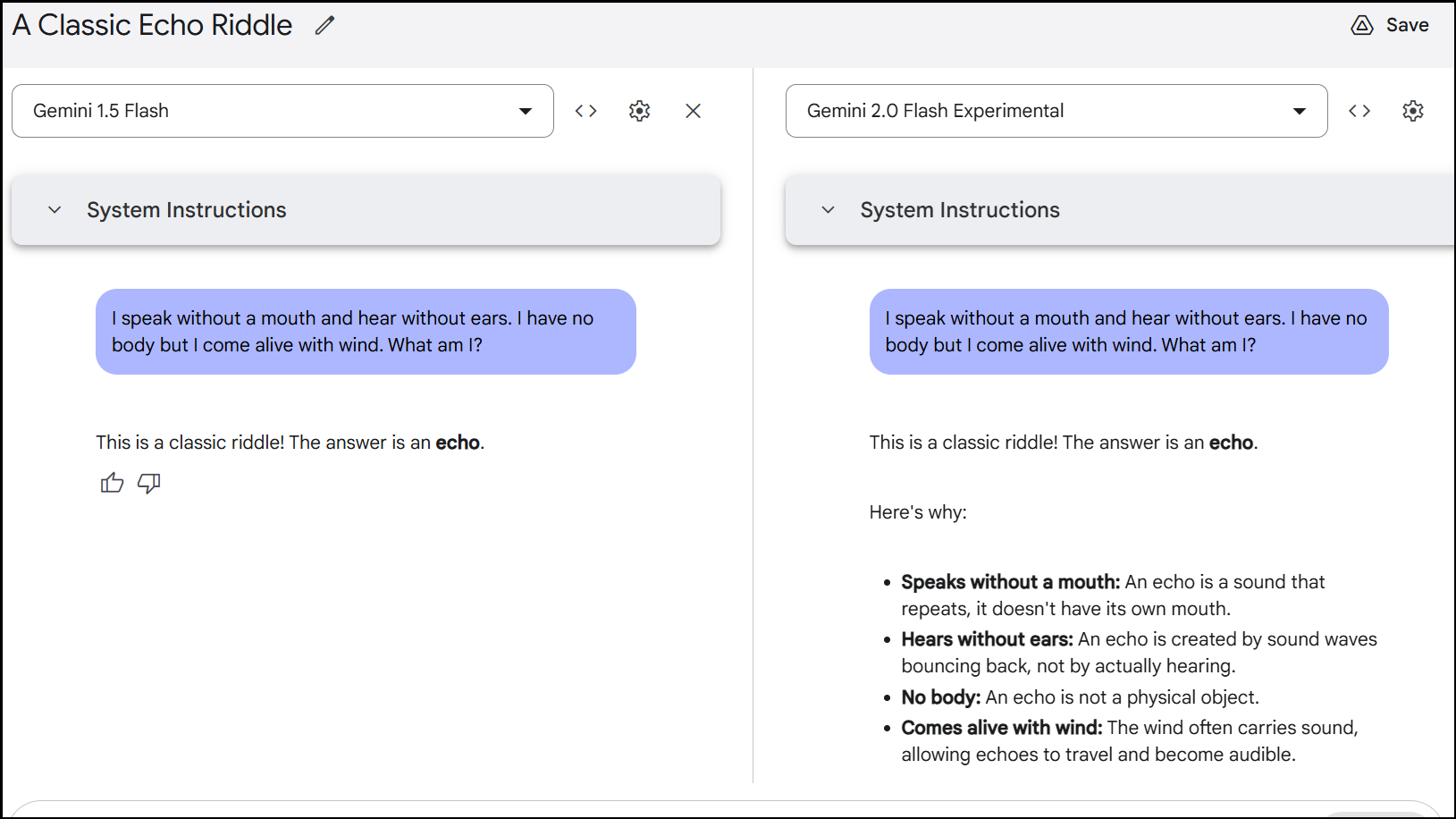 This is a classic riddle that most models get right. Gemini 1.5 got the riddle right away, but Gemini 2.0 came up with an answer that almost fit the bill, but not quite. The answer was echo, but Gemini 2.0 came up with whistle citing the following explanation: