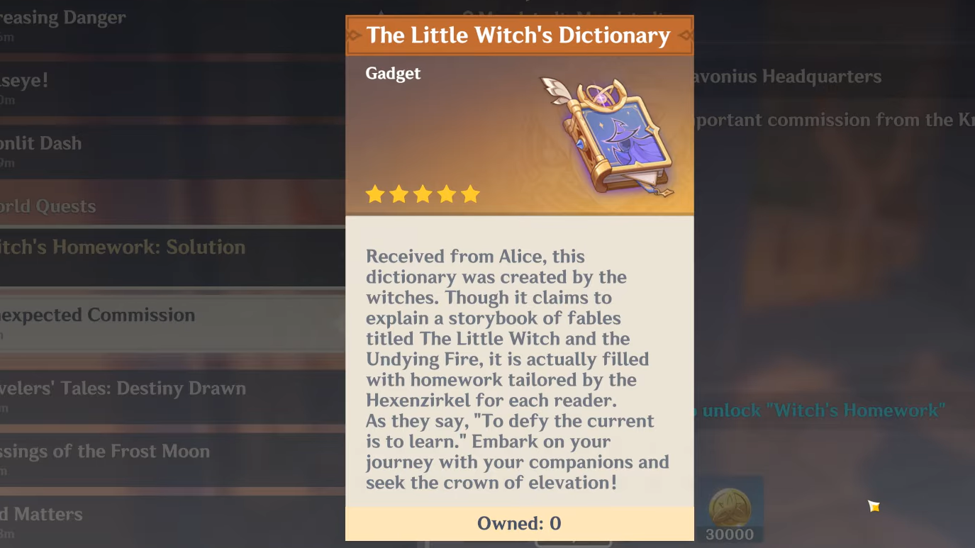 Finishing this quest permanently adds The Little Witch’s Dictionary to your account and unlocks the Witch’s Homework interface, where all Hexerei assignments live.