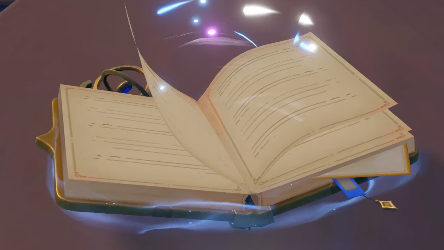 Step 4: Interact with the dictionary. Opening it pulls you into a mage’s domain where Alice explains the purpose of Witch’s Homework and the Hexerei assignments tailored for Mondstadt’s people.