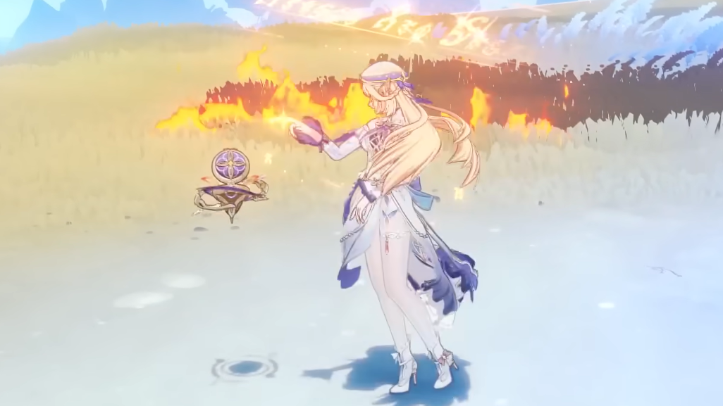 Nicole's Elemental Skill involves a hand-swinging motion that triggers an explosion effect and generates a shield. Earlier kit leaks pegged her as a shielder, and this animation confirms that role. The shield itself carries an elven design language consistent with the fairy-tale aesthetic woven throughout her entire character model and splash art.