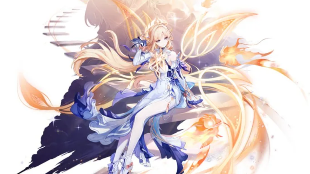 Nicole's splash art depicts her sitting elegantly atop a set of glowing, ethereal stairs. Fairy and elven motifs fill the composition, and a seele rests near her feet. The color palette blends soft blues and warm oranges, creating a striking contrast that makes her silhouette immediately readable — a notable improvement over some recent splash arts that players felt were too dark or too busy during the wish animation.