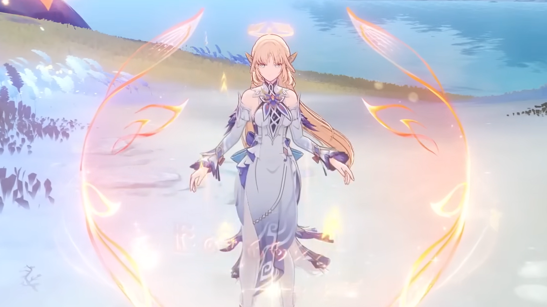 The Elemental Burst is where Nicole's design reaches its most dramatic. Upon activation, she sprouts translucent wings and ascends an ethereal staircase — a visual that reinforces her connection to the angels of Teyvat. A seele materializes beside her during the animation.