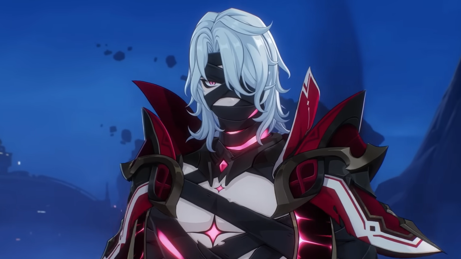 Rerir’s physical form is a tall, pale, heavily bandaged figure: shoulder‑length white hair; pink eyes with slit pupils; black, wrapping‑like bindings obscuring most of his face and body, with exposed chest and intermittent red‑pink energy blotches. Ornamental black‑and‑gold armor flares at the shoulders and arms, anchored by a jagged crimson cape that darkens toward the hem, plus dark trousers, a gold belt, and tall black boots with gold outsoles.