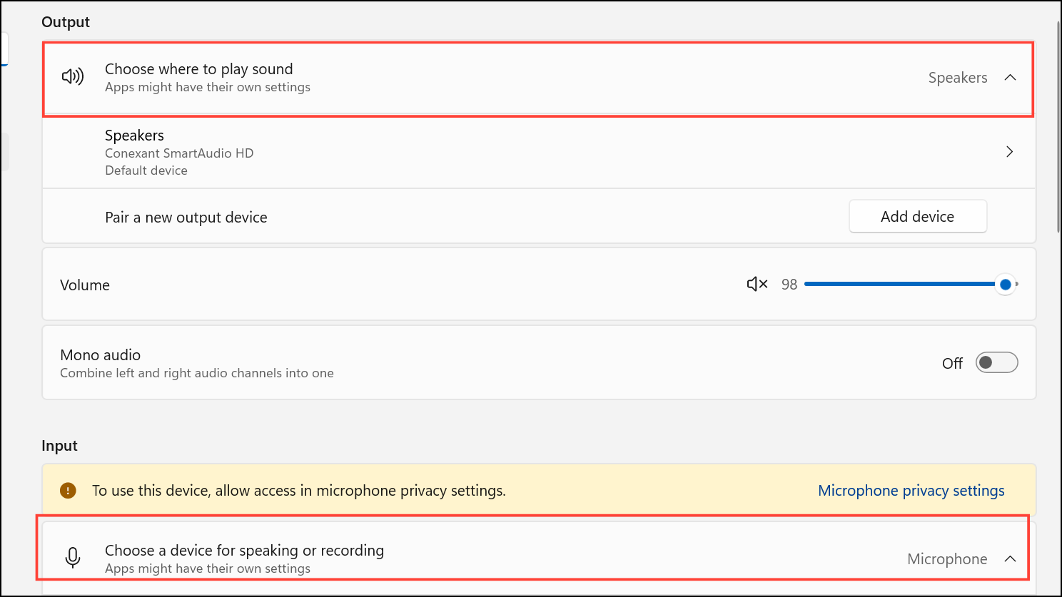 Step 2: Under "Output," verify which device is selected for audio playback. Under "Input," check the microphone device.