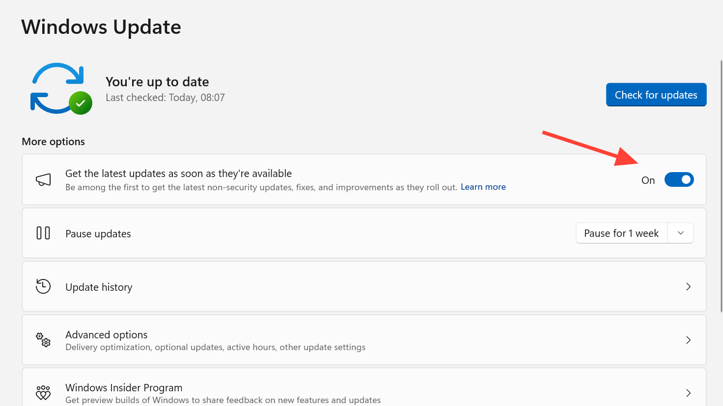 Step 1: Open Settings and go to Windows Update. Turn on the toggle for “Get the latest updates as soon as they’re available” so your device is offered the preview update promptly.