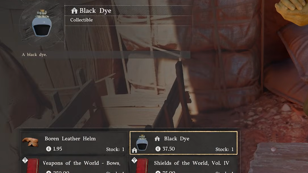 After you finish the full questline, a Black Market Vendor becomes available in Muiquun. You may need to fast travel away and back to force the merchant to spawn. The vendor sells Black Dye directly — no crafting ingredients required, since Black Dye has no Cauldron recipe.