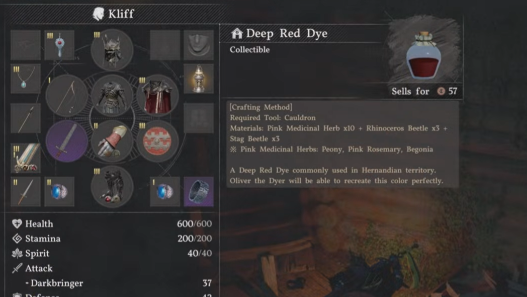 | Deep Red Dye (darkest shade) | Found at Ford Cabin in Hook Rapids, north of Hernand; also at Sunset Valley or Kharonso Equipment Shop Shed | The bottom-left hues in the Hernandian palette appear very dark grey or near-black on most armor |