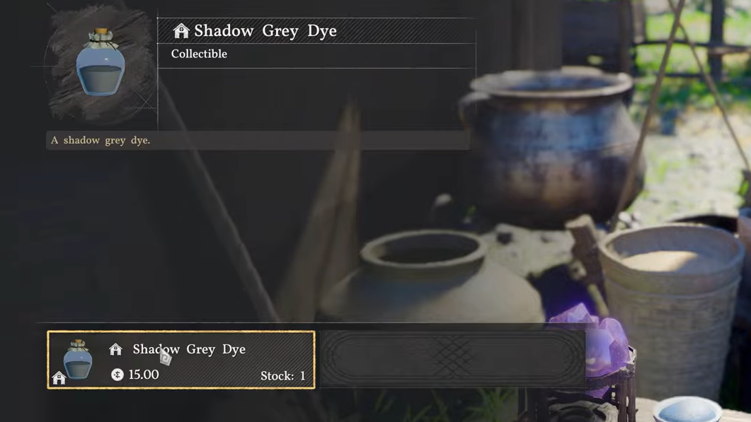 Some online listings mention a "Midnight Black Dye" supposedly crafted from squid ink, crow wings, and mordant. Players who have completed the main story have not been able to verify this recipe in-game. Mordant in particular has proven nearly impossible to locate, and nobody has reliably confirmed obtaining Midnight Black Dye through crafting. The consensus among players who have finished the game is that this recipe is likely fabricated. Black Dye, Grey Dye, and Shadow Grey Dye are all non-craftable items — they come exclusively from quest rewards or vendor purchases.