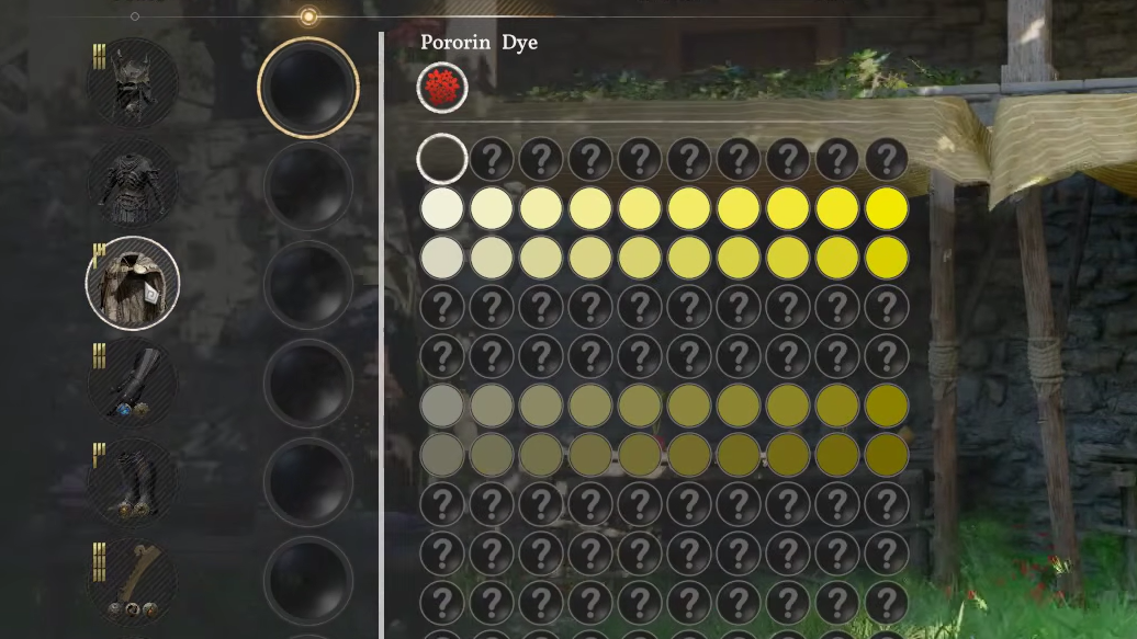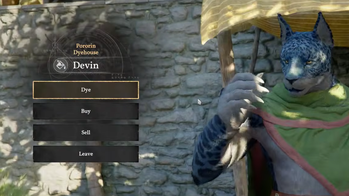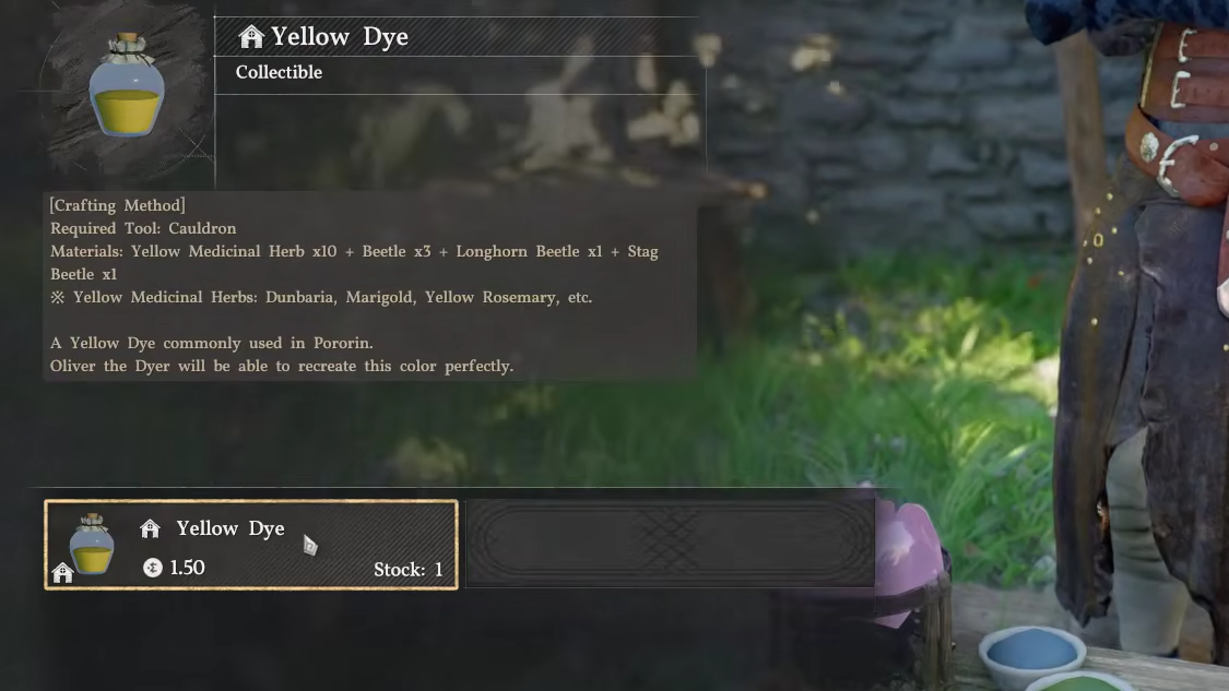 Step 1: Head to the Pororin Dyehouse, run by a merchant named Devin on the north side of the village. This Dyehouse handles all yellow-family dyes.