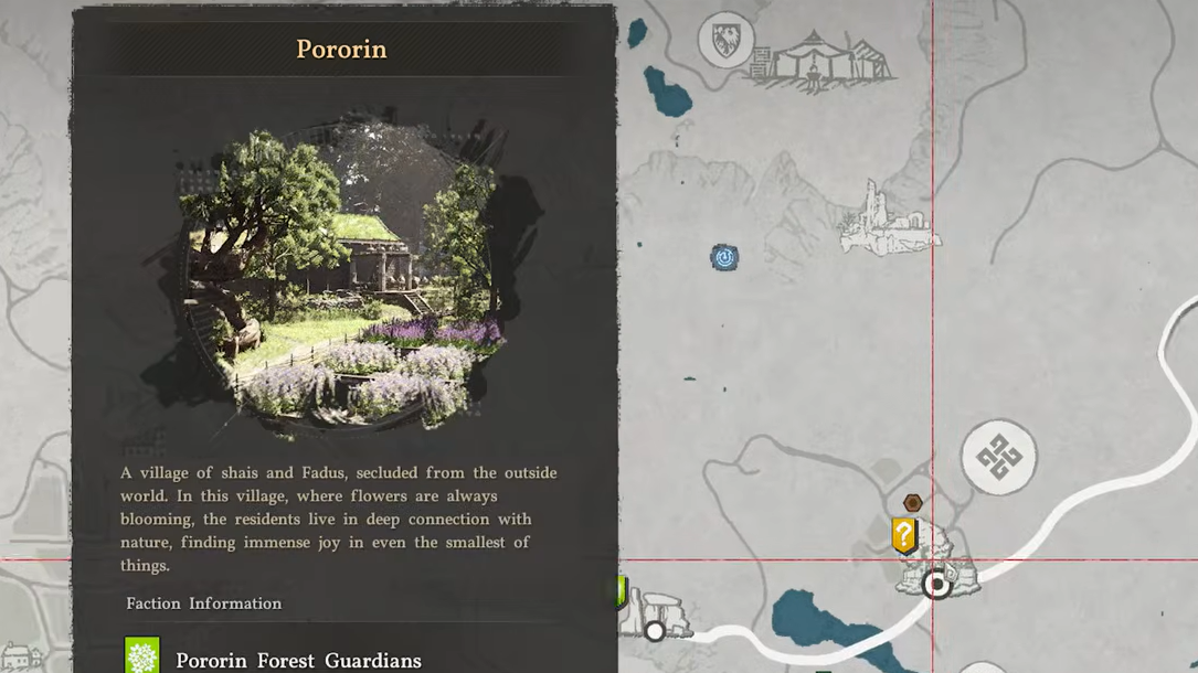 Pororin Village is a hidden Shai settlement in the Hernand region. You need to complete the Faction Quest called The Unreachable Village before the forest dwellers let you in freely. Expect to be knocked out by them a few times before the quest triggers.
