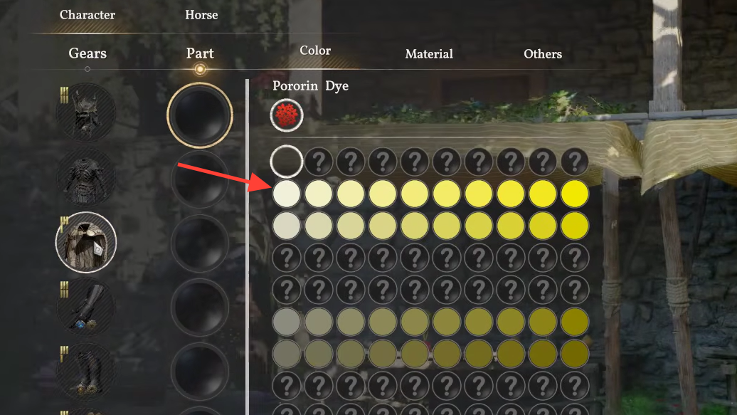 | Bright Yellow's white shade | Only accessible at a yellow-family Dyehouse (Pororin or Greymane Camp after unlocking Oliver) |