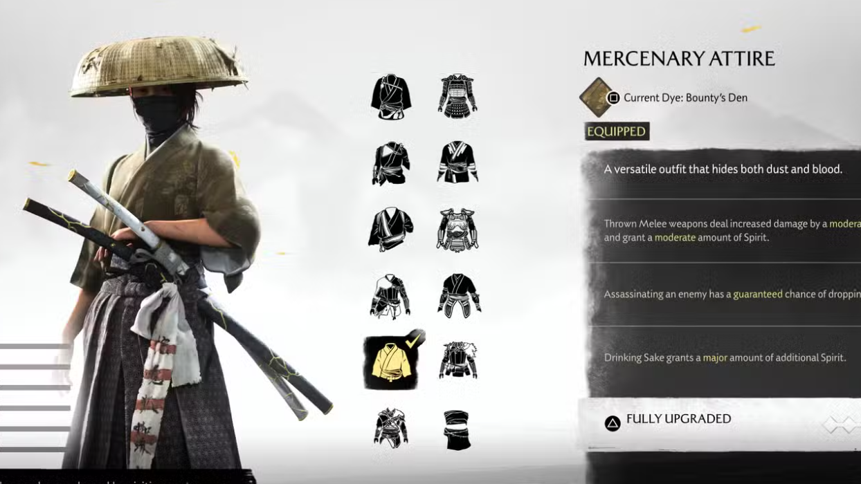 | Mercenary Attire | Story mission when infiltrating a fortress in disguise (Belly of the Beast) | Thrown melee weapons hit harder and grant Spirit; assassinations may drop sake; drinking sake grants extra Spirit. |