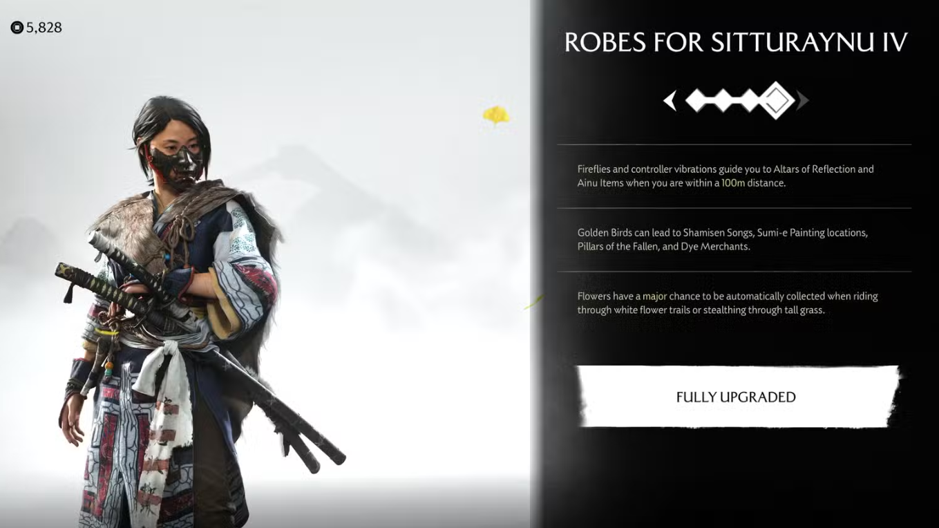 Unlike other outfits, the Robes don’t consume coin and crafting materials. Collect Ainu Items across Ezo and return them to Kaeka the Weaver in Husko Kotan to increase their guidance radius, add more destinations Golden Birds can highlight, and increase the chance flowers are auto‑collected while you travel. It’s the set to wear when you want the world to surface its secrets.