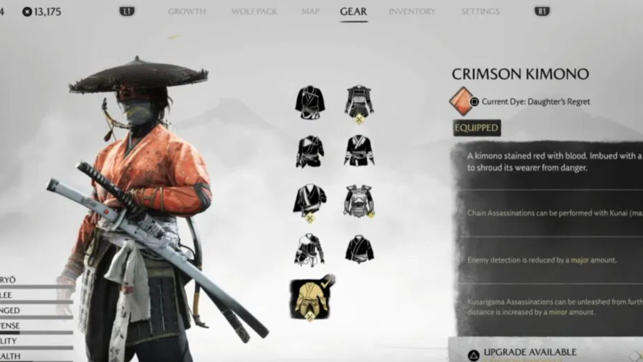 | Onryō Armor | Available at start (story) | After story upgrades, killing with Spirit/throws can Terrify; the Wolf may appear on Terror; Terrified foes take increased damage. |