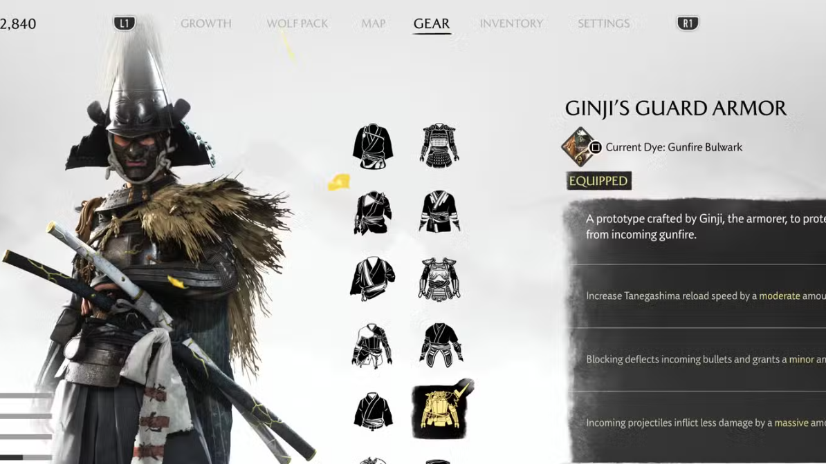 | Ginji’s Guard Armor | Oshima Coast quest near the Matsumae Residences | Anti‑projectile; faster tanegashima reload; blocking deflects bullets and grants Spirit; reduced projectile damage. |