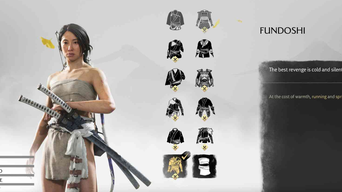 The fundoshi is technically the twelfth set. Bathe at all 16 Hot Springs to unlock it. It removes the sound you normally make while running and sprinting, but the tradeoff is reduced warmth, making frostbite more likely in cold regions.