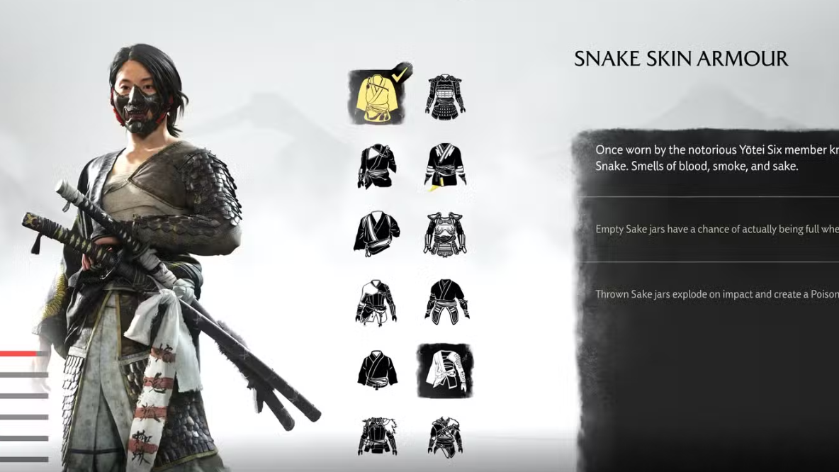 If you own the Deluxe Edition, you also receive the Snake Skin Armor. It can’t be upgraded and revolves around sake jars: some “empty” jars turn out to be full when picked up, and thrown jars explode on impact, leaving a poisonous cloud.