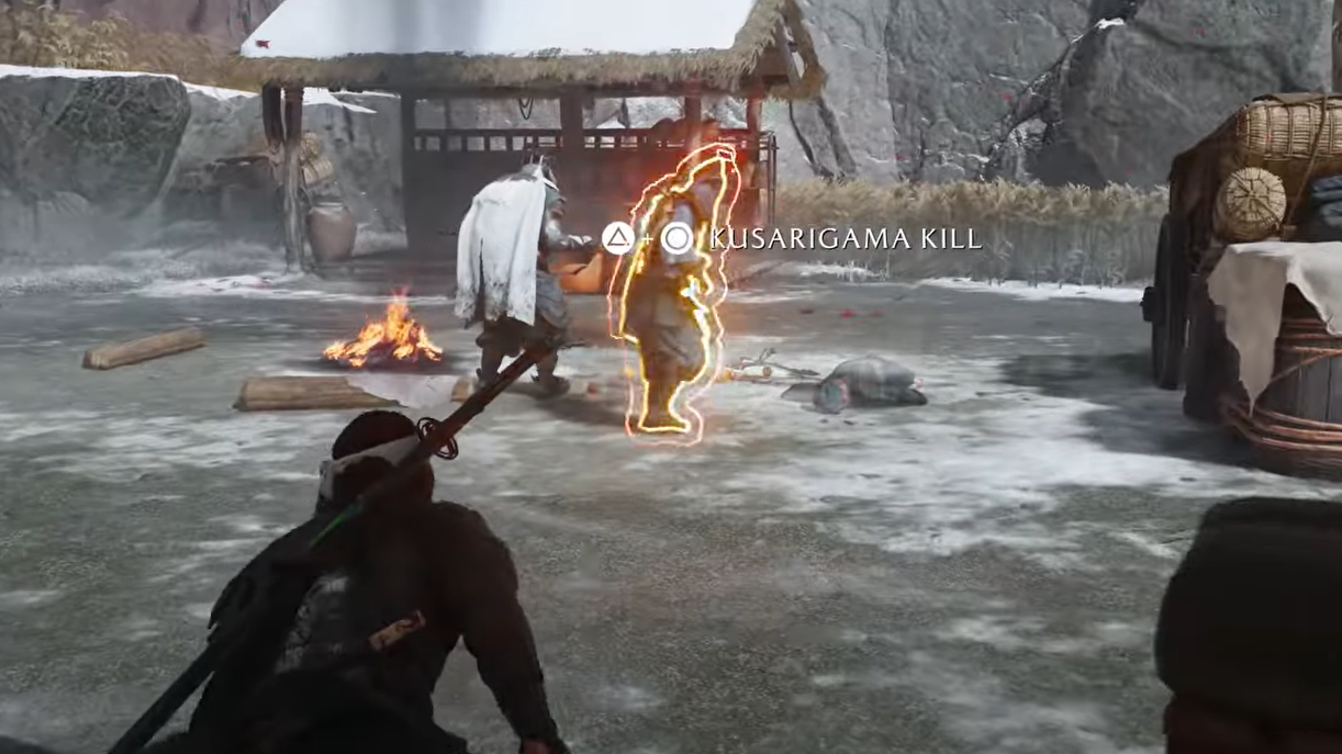 Find a lone enemy and enter stealth. Approach from behind; when you’re within a few meters, a contextual prompt appears for the kusarigama takedown. With at least one Spirit available, press Triangle + Circle to sling the chain and yank the target into a lethal follow-up. The trophy pops as the animation completes.