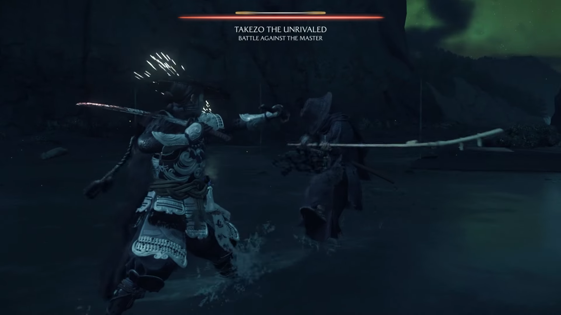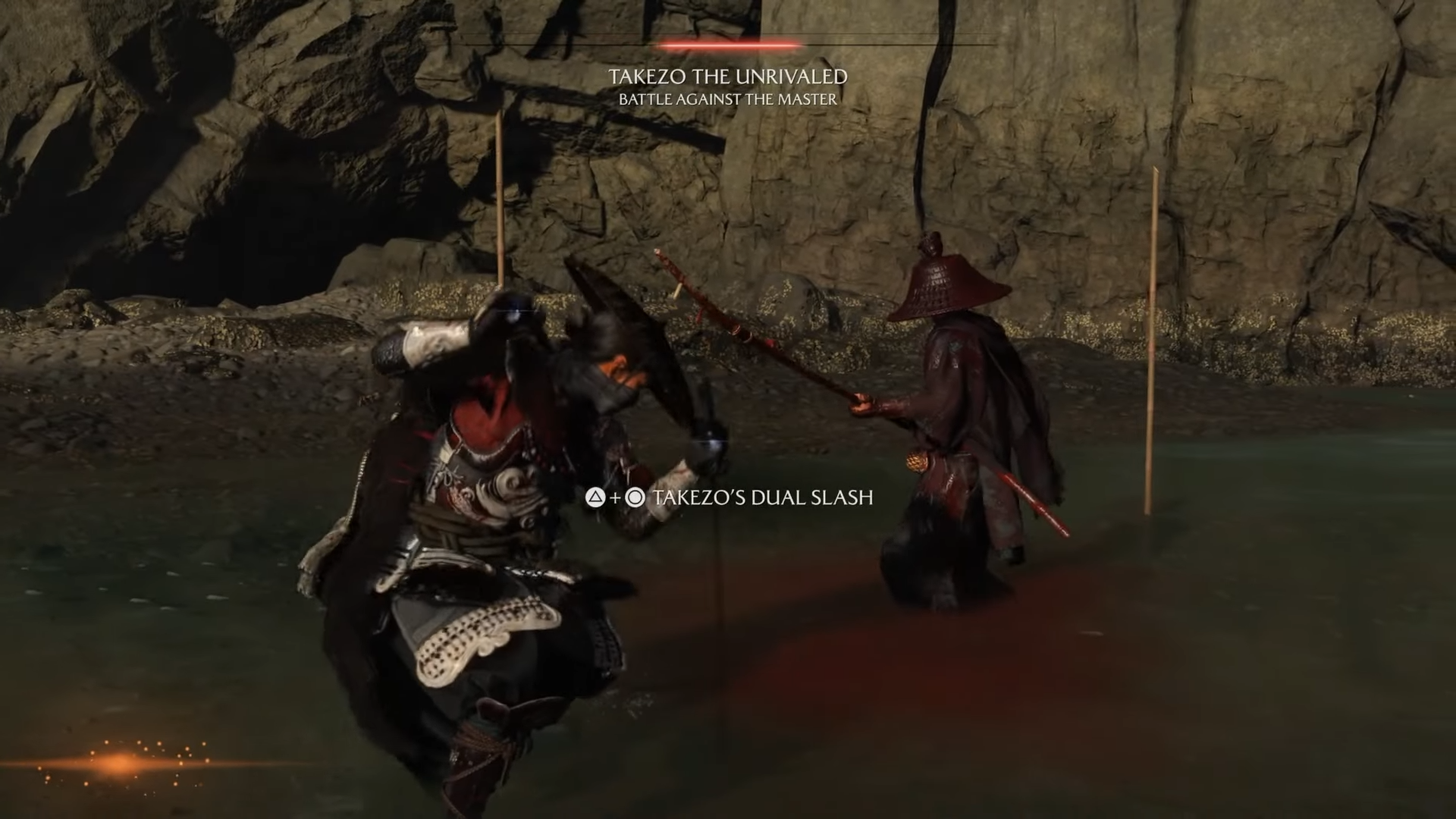 When his health drops to the final segment, he teaches you Takezo’s Dual Slash. Equip Dual Katanas and execute it by pressing Triangle + Circle together. Performing the technique concludes the myth and unlocks the Dual Katana Spirit Attack.