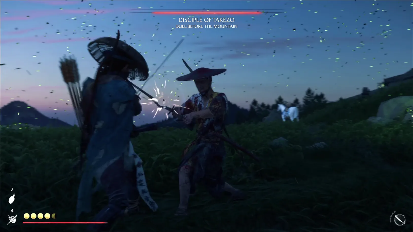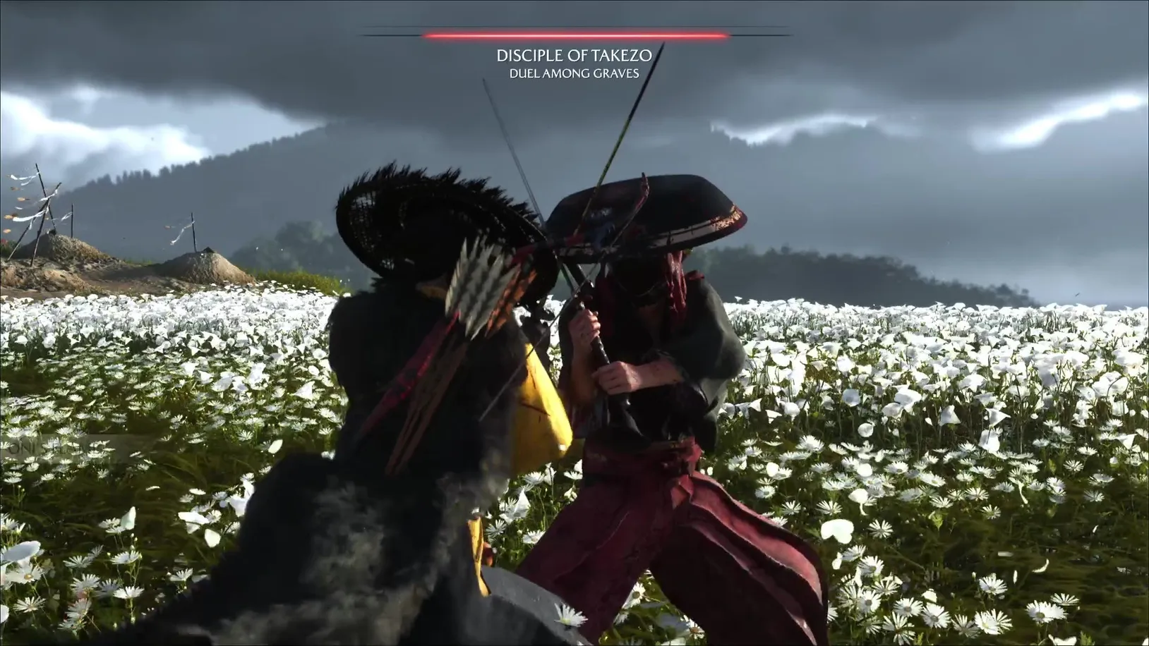 | Among Graves | Shikotsu River, Yotei Grasslands (white flower field) | Overhead strike into stab; unblockable shoulder check; announces a disarm draw | Swaps from katana to dual blades | Takezo’s Charm of the Unrelenting Warrior |