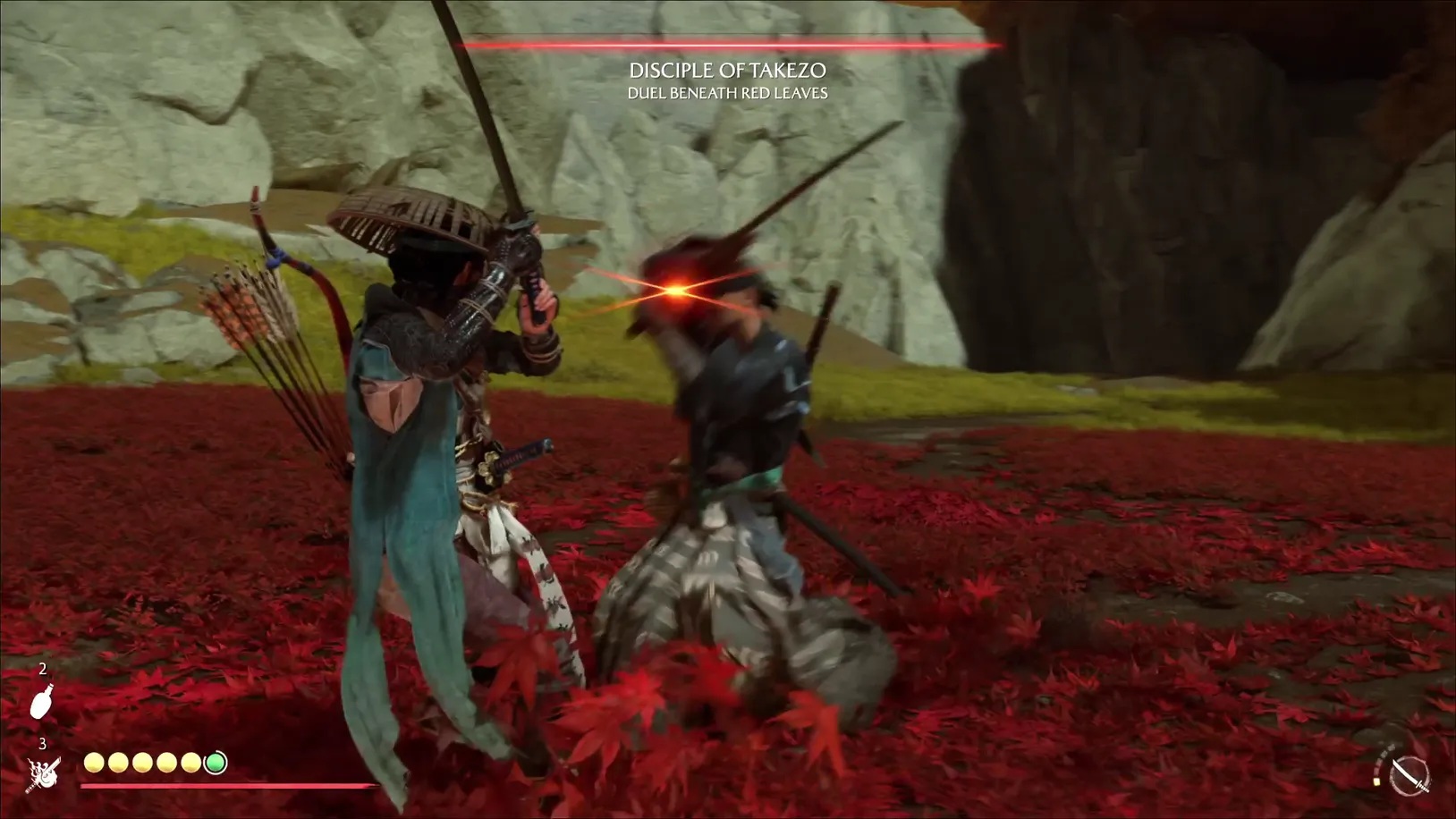 | Beneath Red Leaves | NW Tokachi Range, past Yubari Lake | Unblockable overhead + behind‑the‑back spin, then a parryable finish; spinning gap‑closer | Swaps to dual kama | Takezo’s Charm of Bold Deflection |