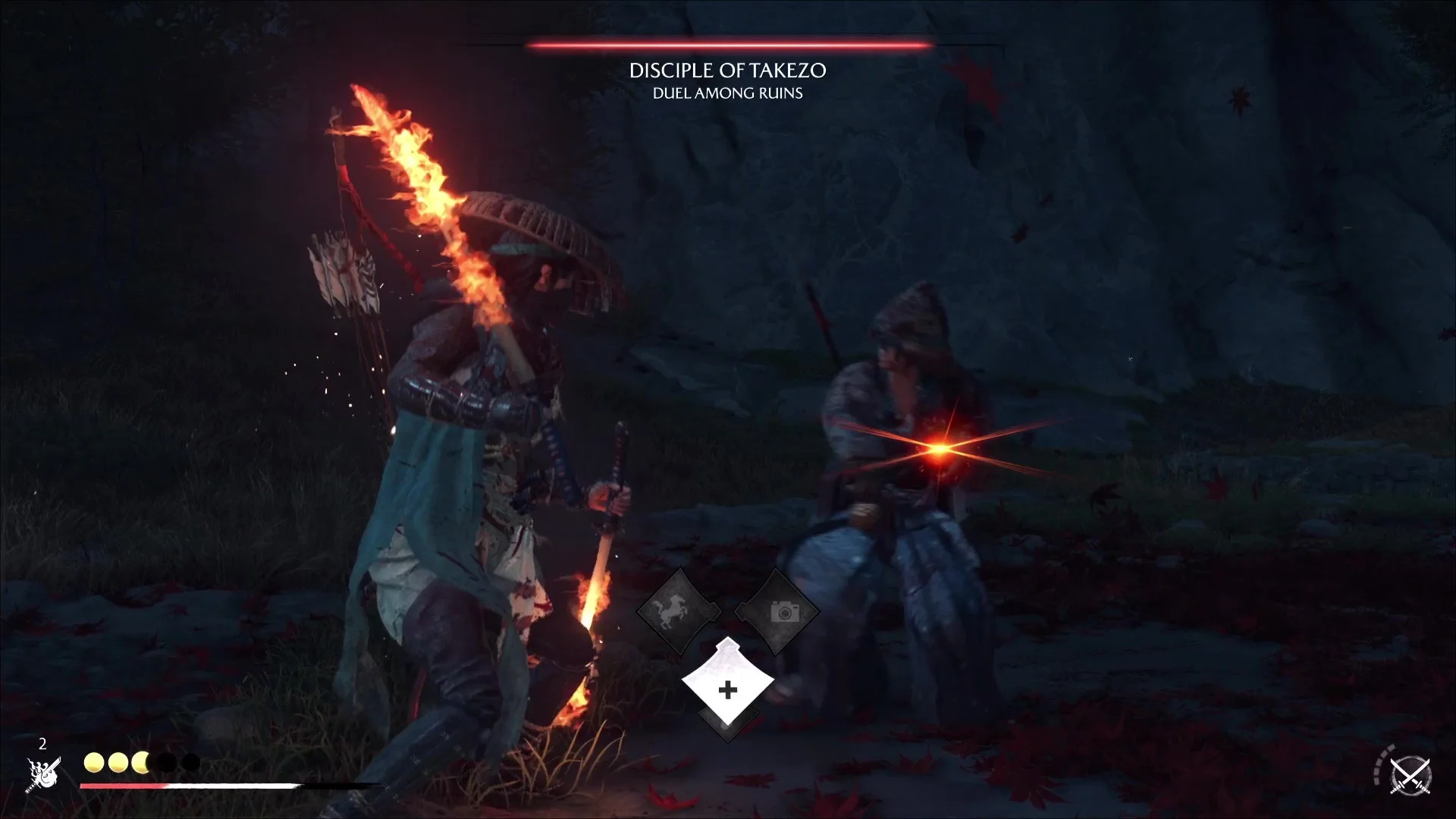 - Beneath Red Leaves: Treat the unblockable opener as a dodge check and look for the parryable final slash. The spinning advance is harder to time—sidestep rather than fishing for perfect parries. Kama phase favors steady guard with dodges on glints.