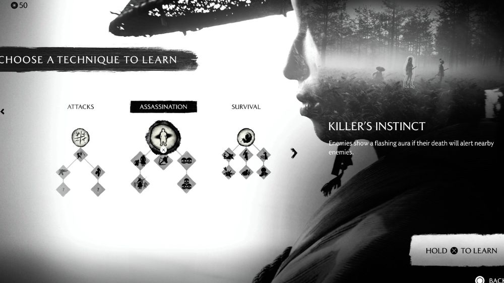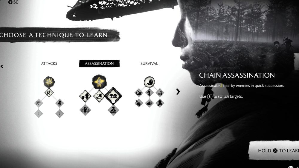 Ghost of Yotei changes how stealth “awareness” works. Jin Sakai’s Focused Hearing from Ghost of Tsushima — the scan that outlined enemies through walls at the press of a button — isn’t present here. Atsu doesn’t learn a comparable mode, and there’s no skill or setting that restores it at launch. Instead, the game leans on perk-based feedback, audio cues, and classic line-of-sight stealth.