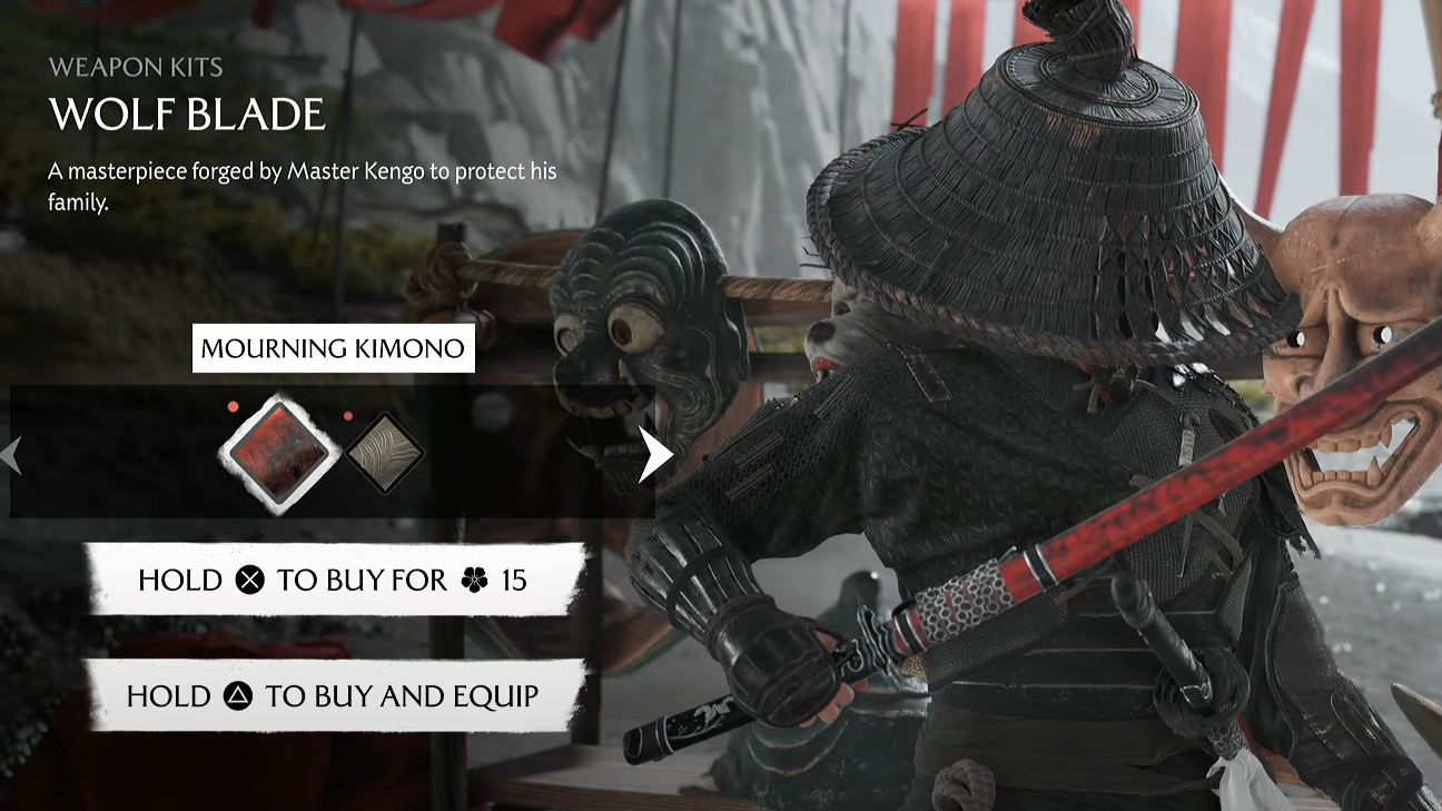 Expect deep red dyes for armor, a few katana kits, a themed hat and mask selection, and basic resources. Pricing is straightforward: most items sit in the 3–15 flower range, with weapon kits and premium dyes at the top of that band. Check back later in the story for expanded stock.
