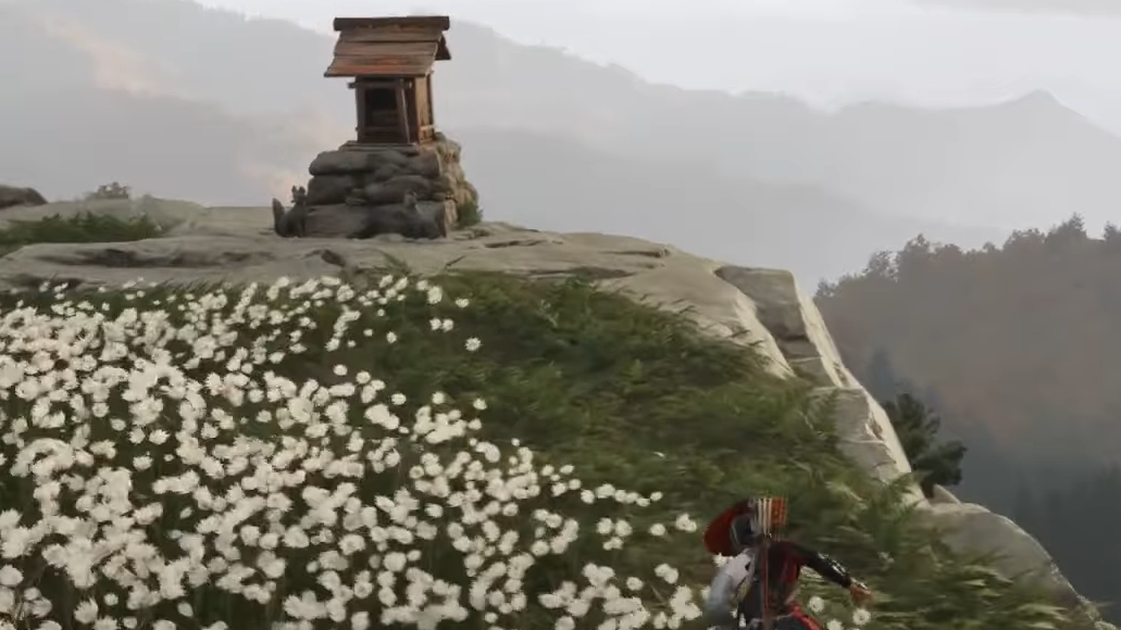 - Final approach: A narrow stone walkway leads into a small flower field just below the summit platform. One last grapple takes you up to the shrine statue—interact to claim the charm.