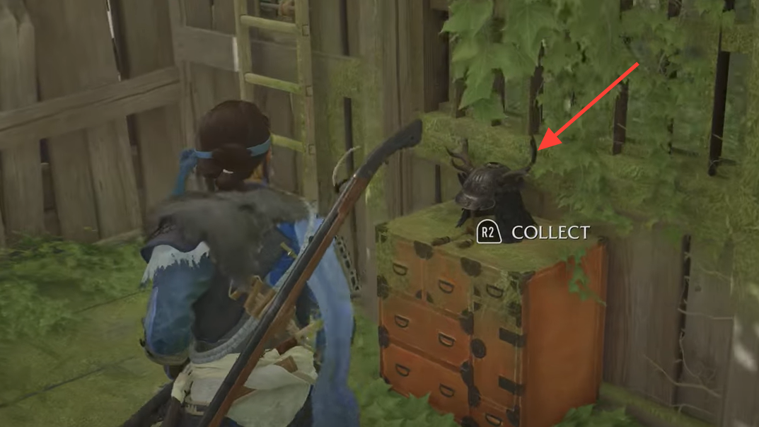 Step 3: Pick up the Clan Sakai Stag Helmet inside the den. This cosmetic unlocks immediately and can be equipped later from your appearance menu.
