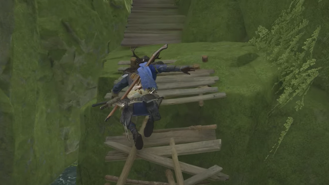 Step 3: Exit the cave into the pool below, then follow the downstream route. Expect a collapsing bridge and a simple crossing; the fox will reappear to keep you on track.