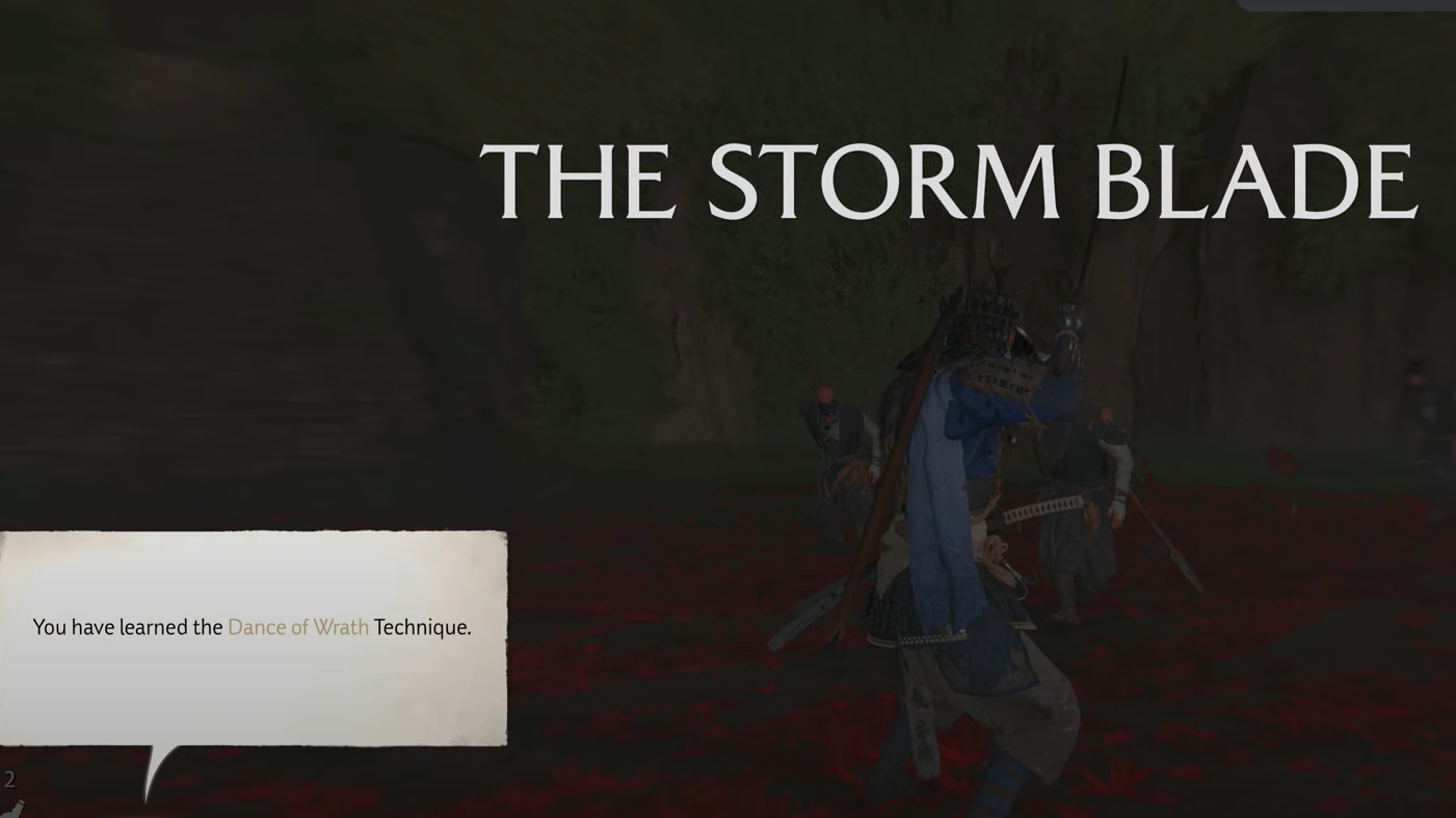 Step 2: After the duel, the Storm Blade sword kit is awarded and the Dance of Wrath technique unlocks. Finish off the remaining raiders in the grove.