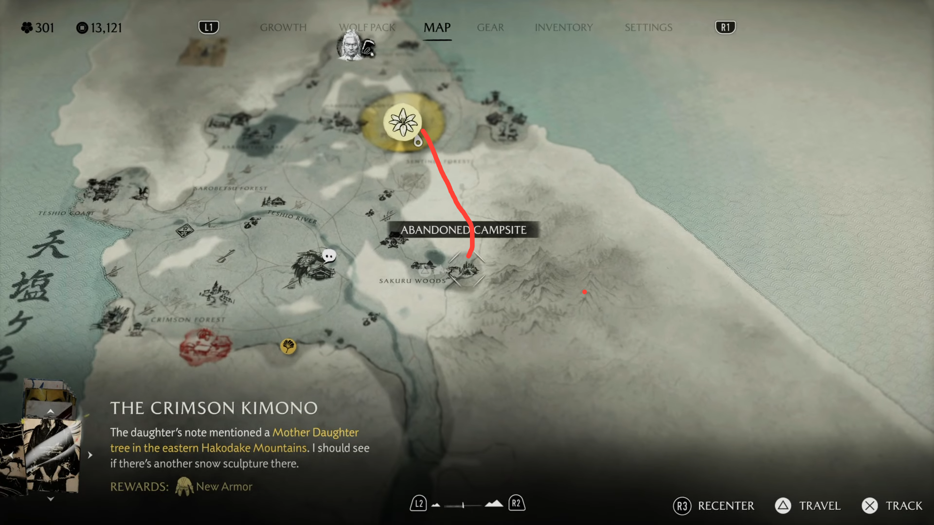 - Start in Sakuru Woods (Mother Daughter Tree): Speak to Ugetsu by the lone orange/yellow tree, then examine the nearby snow sculpture. Follow the red yuki mushi to a small abandoned campsite and read the scroll on the ground.