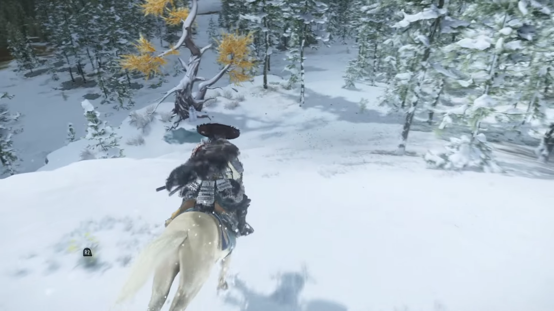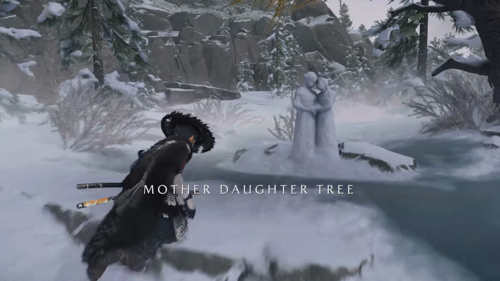 - Cross to the mountain north of Teshio River: From your current position, go southwest to reach it. Find the lone orange Mother Daughter Tree among the white trees and inspect the snow sculpture.