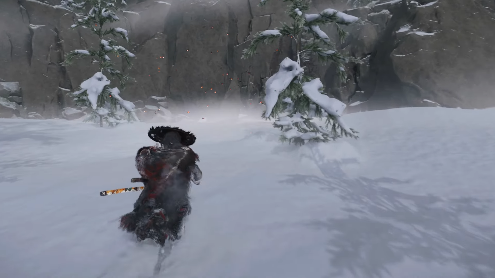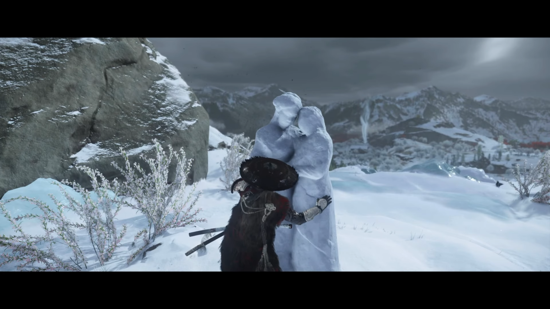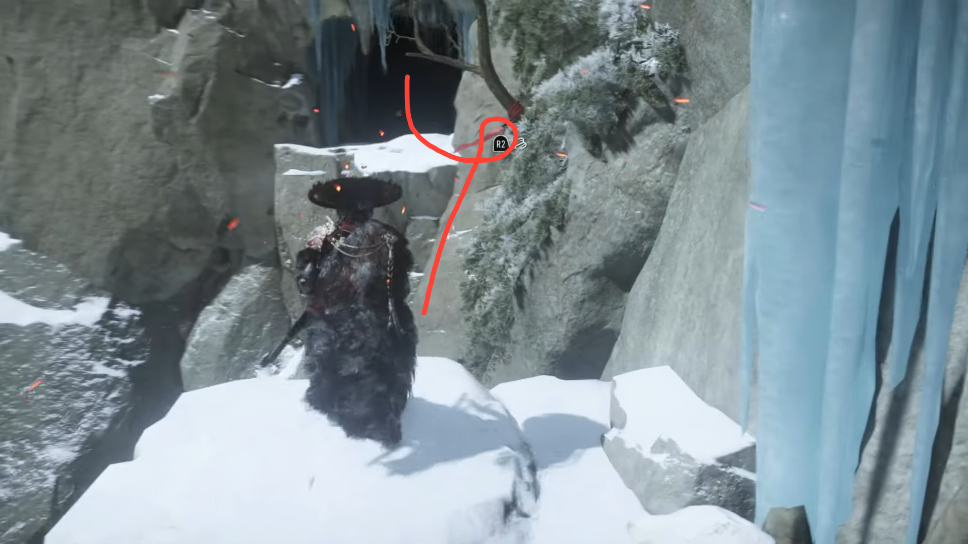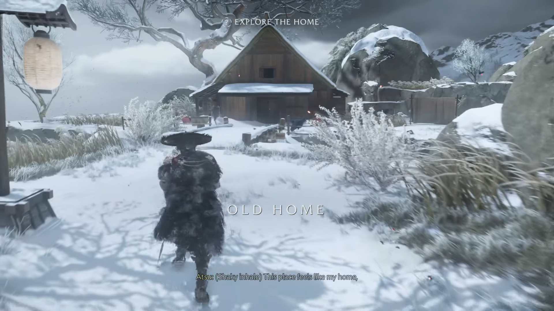 - Crawl into the mountain: Follow the yuki mushi to a low, partially hidden opening and crawl inside. Squeeze through a narrow gap; when you reach a frozen pool, turn right, jump to the far wall, and climb. Continue forward, swing across the gap outside, move through another cave, and you’ll arrive at the Old Home.