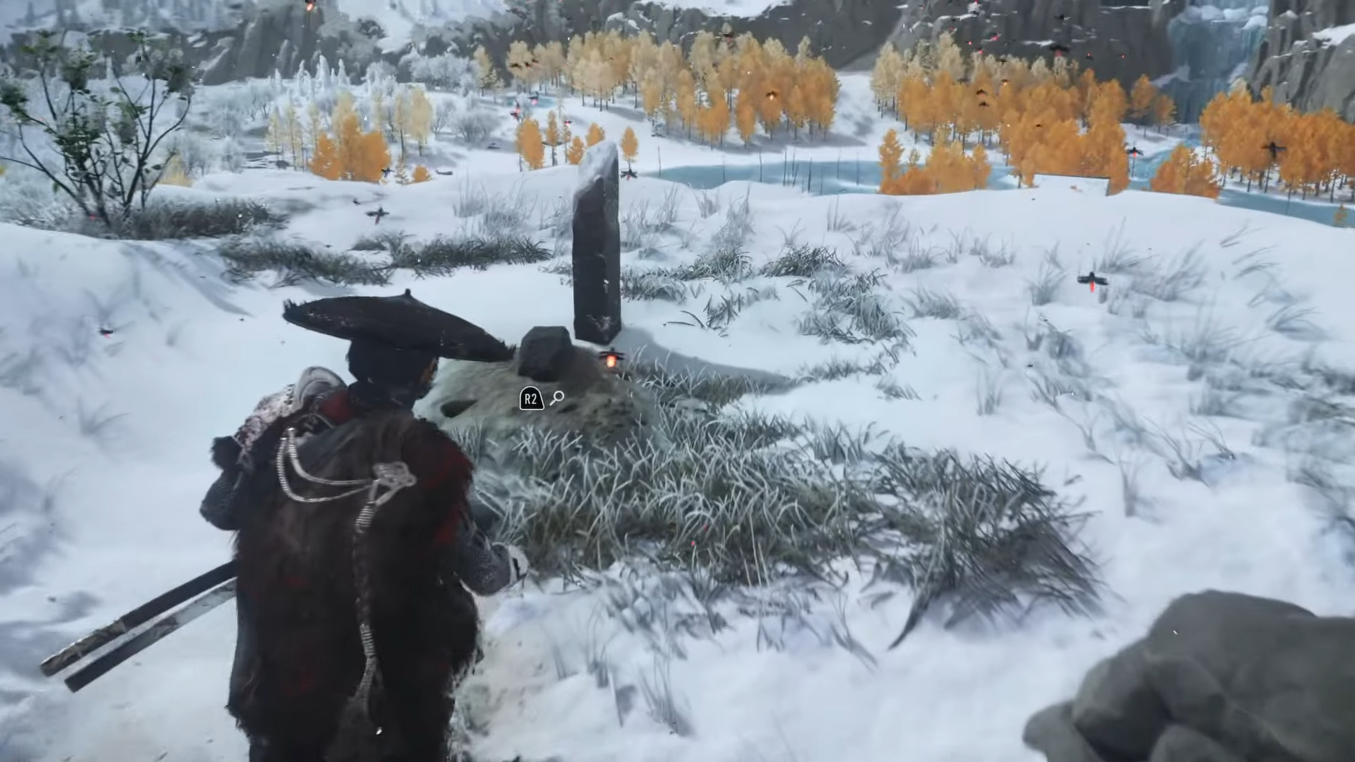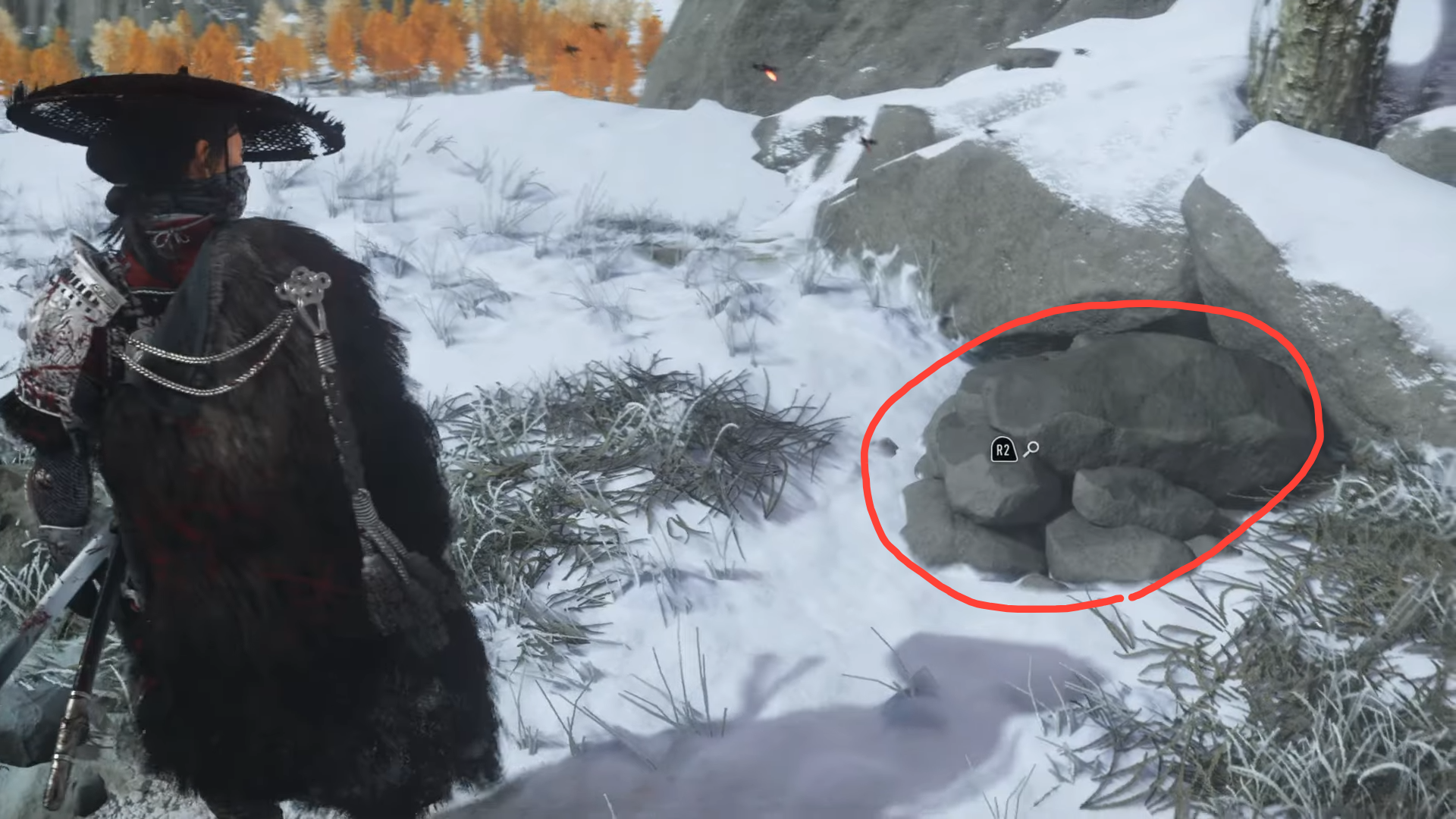 - Follow the yuki mushi one last time to the mother’s grave behind the home. Check the pile of rocks to the right of the grave to claim the Crimson Kimono.