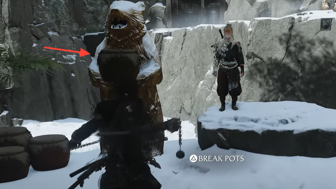 - Destroy the vases held by two bear statues using heavy attacks (Triangle). A rope bridge appears behind them; cross it and squeeze through the gate to more enemies.