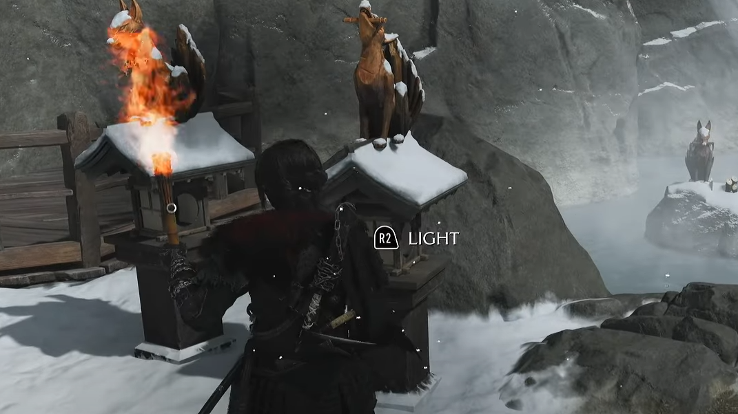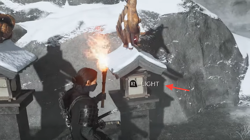 - Light three lanterns at the shrine’s entrance: one opposite the entrance, one to the left, and one to the right. Grab the torch at the center spot to start.