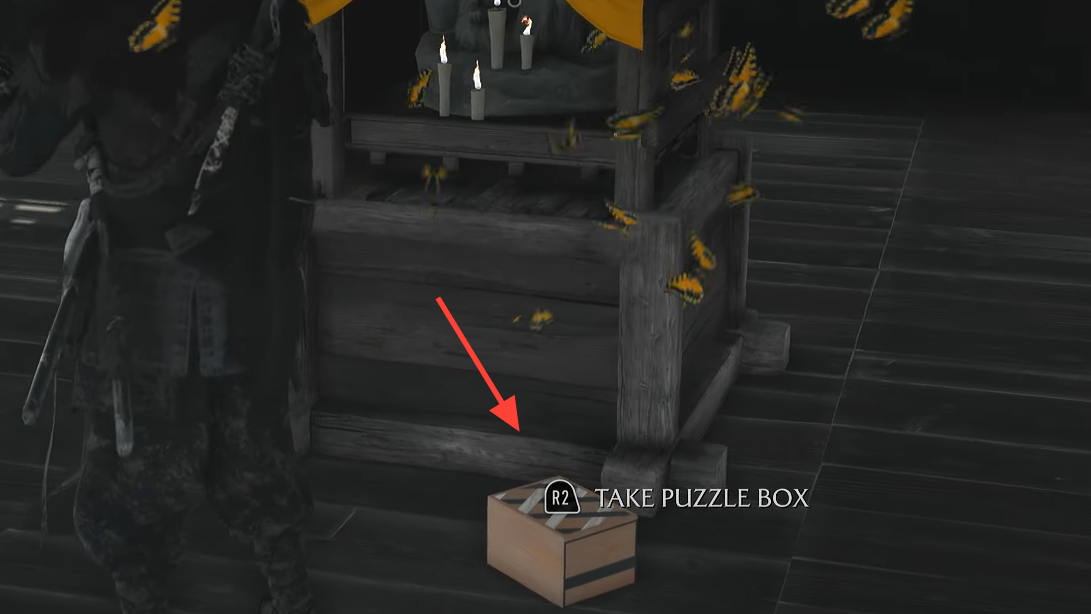 - Pick up the puzzle box; the game shows the exact inputs to open it. After opening, swipe down on the touchpad to pray at the shrine.