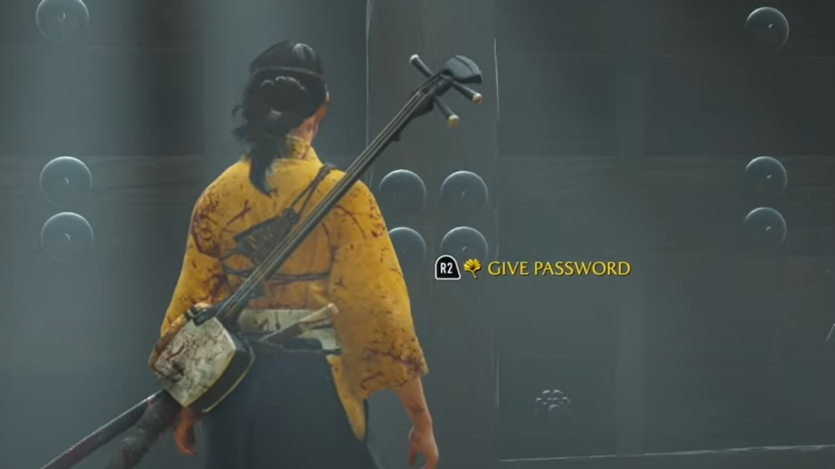 Approach the outer gate and shoulder past the waiting ronin. Interact with the large double doors to give the passphrase. When prompted, select the line exactly as written: