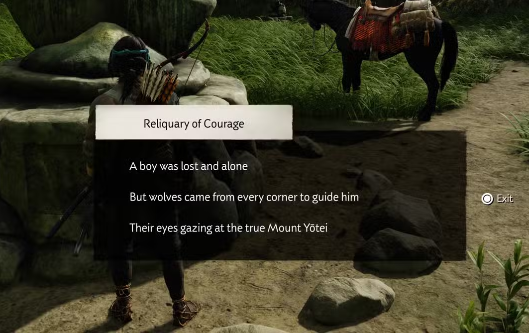 The stone reads like a fable about a lost child guided by wolves whose eyes face the true Mount Yotei. The “wolves” are a clue pointing to gaze and direction — don’t interact with the reliquary yet. Instead, find the four small animal statues placed north, east, south, and west around the pedestal.