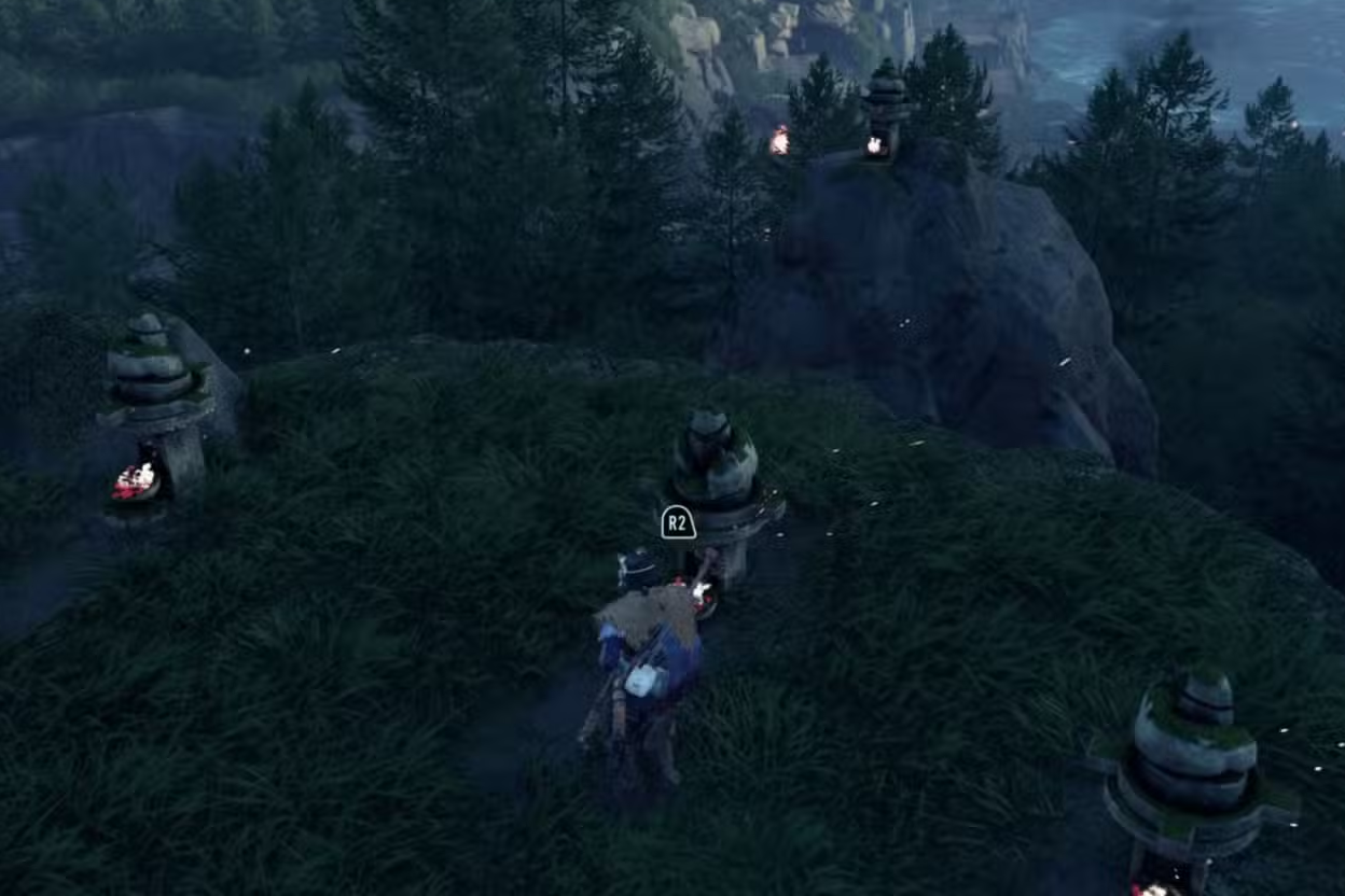 After the introductory cutscene in Oshima Coast, head left as soon as you regain control. Follow the narrow path up to the hillcrest; the reliquary stands at the top. A golden bird may guide you there, but you can reach it quickly by sticking to the left-hand path from the entry point.