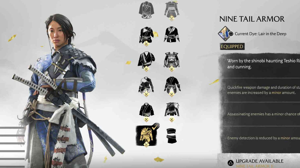 | Nine Tail Armor + Acolyte mask/headband | Upper building of the Nine Tails hideout (Blood on the Snow) | Stealth‑leaning set from Teshio Ridge’s shinobi; equips on pickup. |