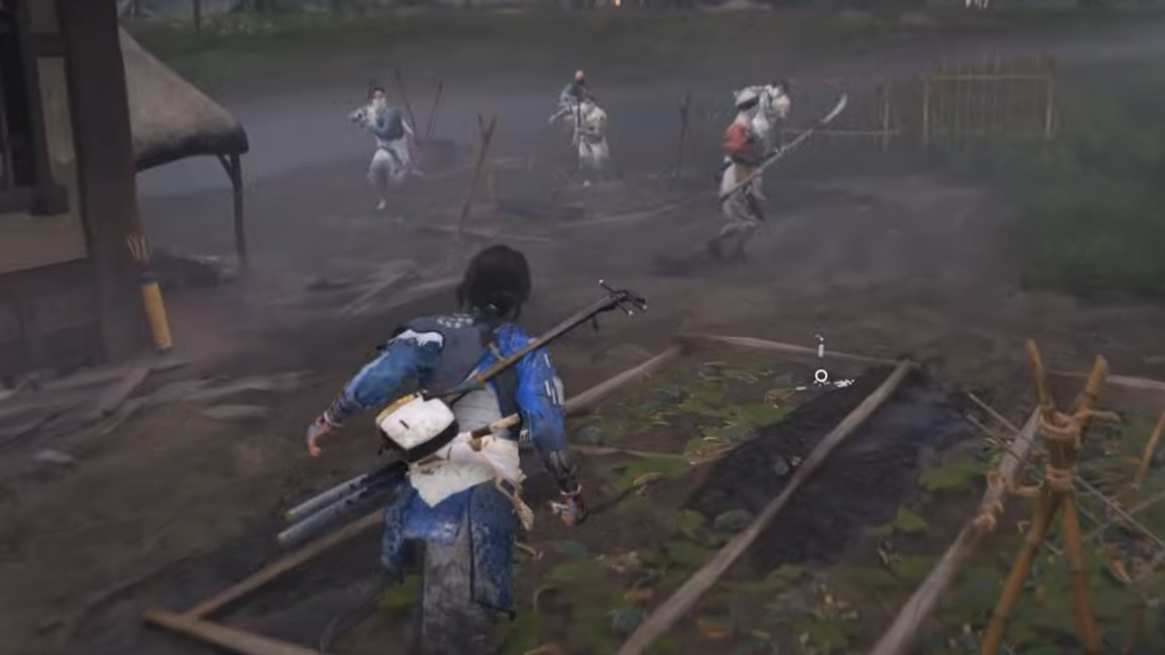 Approach the distressed woman to trigger an ambush—Nine Tails burst out of vases around the yard. After you handle the first wave and Hana arrives, circle behind the house. Another group is concealed in the bushes and will spring when you step close. Clearing the area earns the Charm of Hidden Blades.
