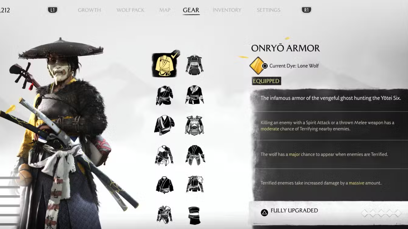| Onryo Armor (starting outfit) | Lists a +45 Onryo stat. Initially perkless, it gains fear-focused perks as it ranks up: kills with Spirit Attacks or thrown melee can terrify nearby enemies; terrified enemies take increased damage; terrified states can trigger the wolf to appear. |